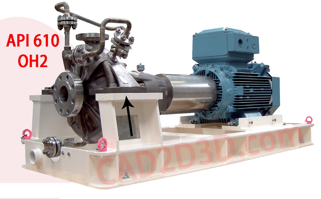 OH2 的定义:Centreline-mounted, single-stage overhung pumps shall be designated pump type OH2. They have a single bearing housing to absorb all forces imposed upon the pump shaft and maintain rotor position during operation. The pumps are mounted on a baseplate and are flexibly coupled to their drivers.(中心线安装,单级悬臂泵,称为 OH2。有一个单独的轴承箱,用来吸收附加在泵轴上的所有的力,并且保持转子运行时的位置。泵安装在一个底座上,并通过弹性联轴器与驱动装置相连)