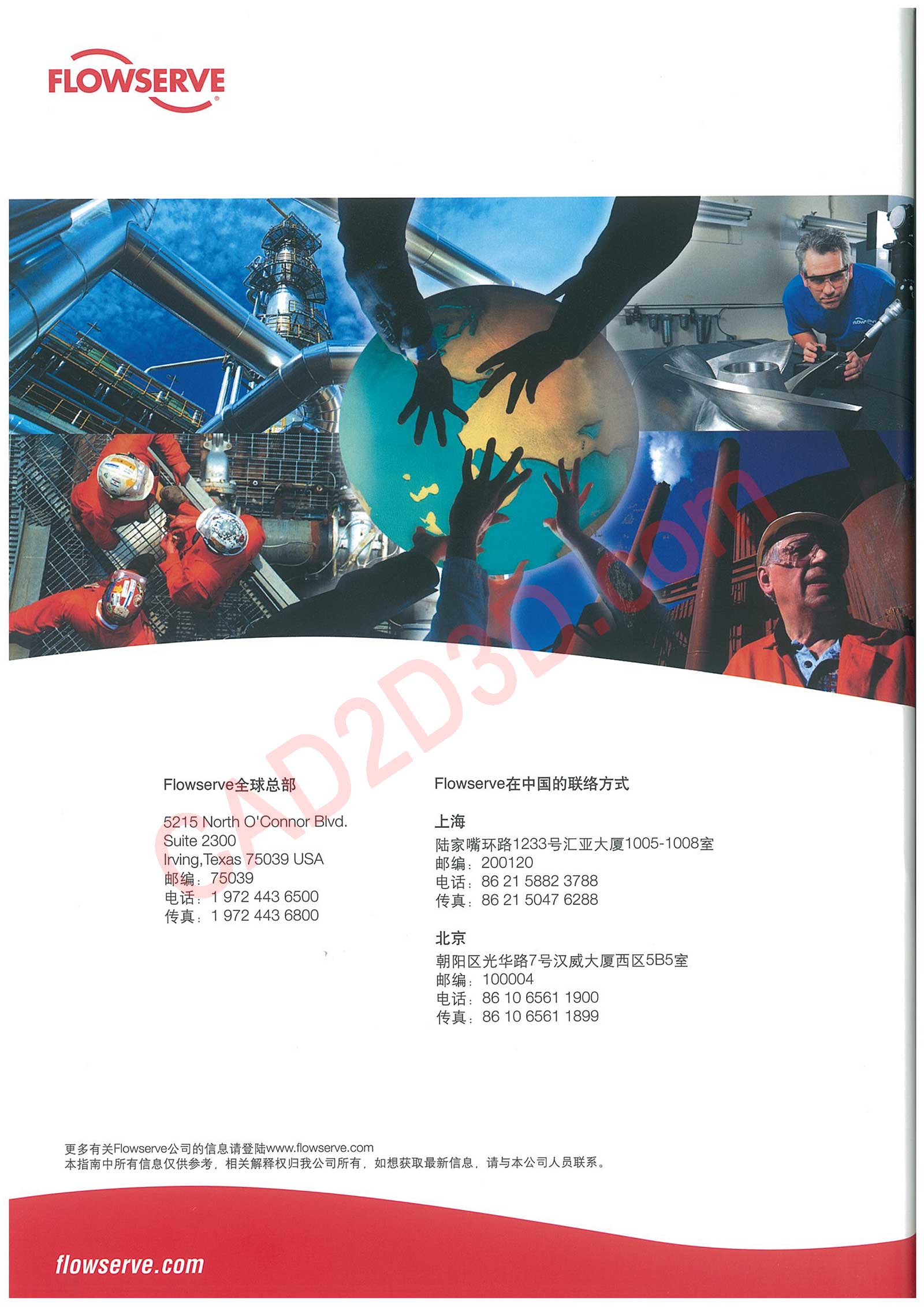 Flowserve 全球总部 Flowserve 在中国的联络方式 5215 North O'Connor Blvd. 上海Suite 2300 陆家嘴环路 1233 号汇亚大厦 1005-1008 室Irving, Texas 75039 USA B4%. 200120[S%E; 75039 电话 : 86 21 5882 3788电话 : 1 972 443 6500 传真,86 21 5047 6288传真 : 1 972 443 6800北京朝阳区光华路 7 号汉威大厦西区 5B5 室邮编 : 100004电话 : 86 10 6561 1900传真 ; 86 10 6561 1899 更多有关 Flowserve 公司的信息请登陆 www.flowserve.com本指南中所有信息仅供参考,相关解释权归我公司所有,如想获取最新信息,请与本公司人员联系。